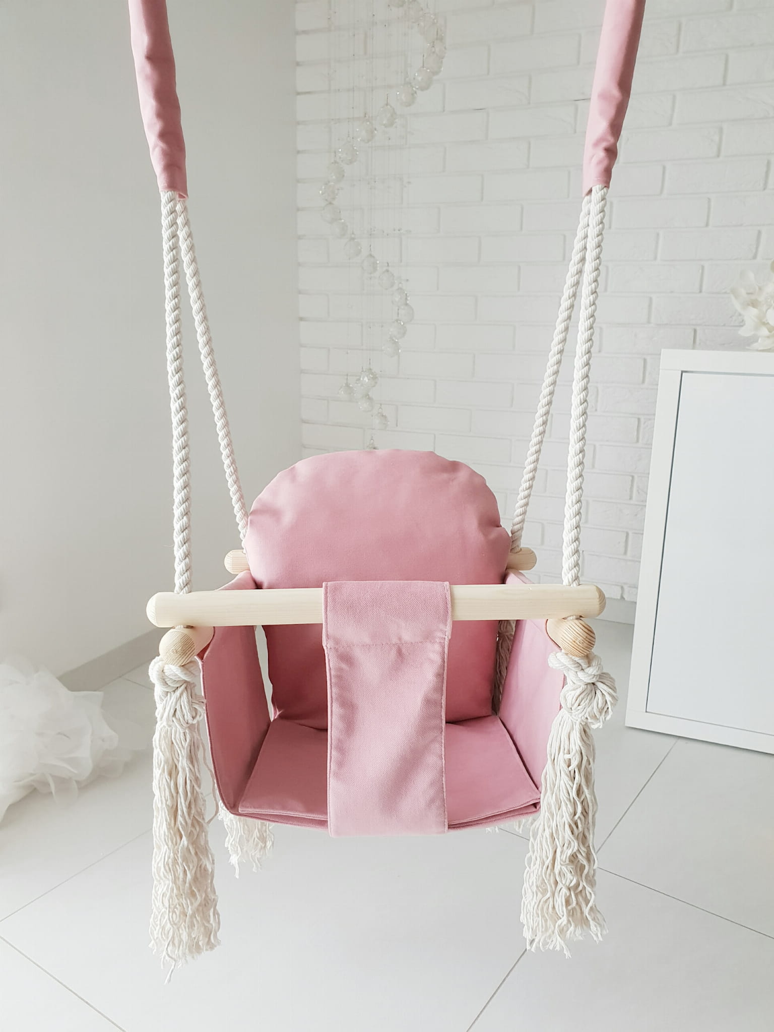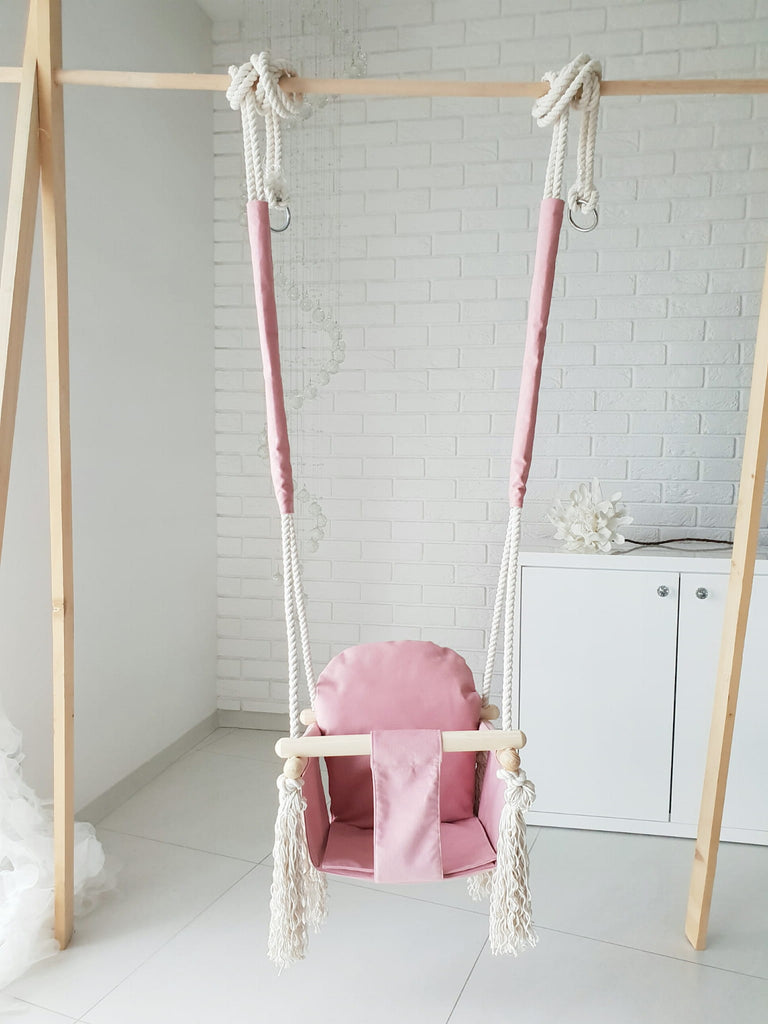 Den omfamnande sitsen ger ett sÀkert stöd, medan de starka repen och den solida trÀkonstruktionen ser till att varje gung blir bÄde stabil och rolig. Perfekt i barnrummet, pÄ verandan eller varhelst ni vill skapa en stund av lugn och skratt.