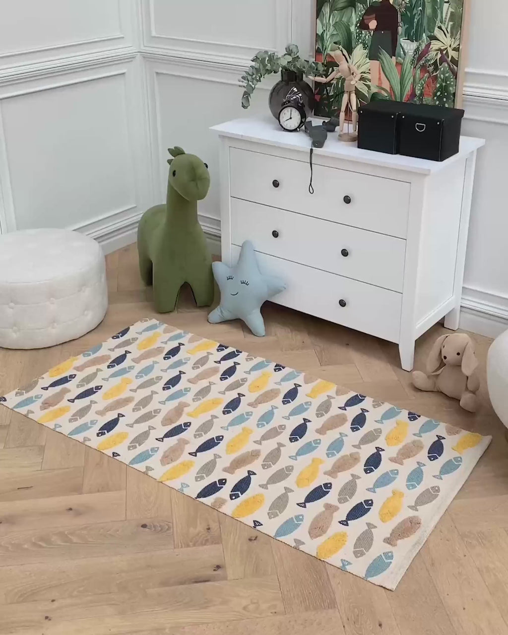 Med sin tidlösa design tillför mattan både lekfullhet och mysig charm till barnkammare, sovrum eller lekrum. Den halkskyddade, sprayade baksidan ser till att mattan ligger stadigt på plats, så att små fötter kan leka tryggt hela dagen. 🐾✨