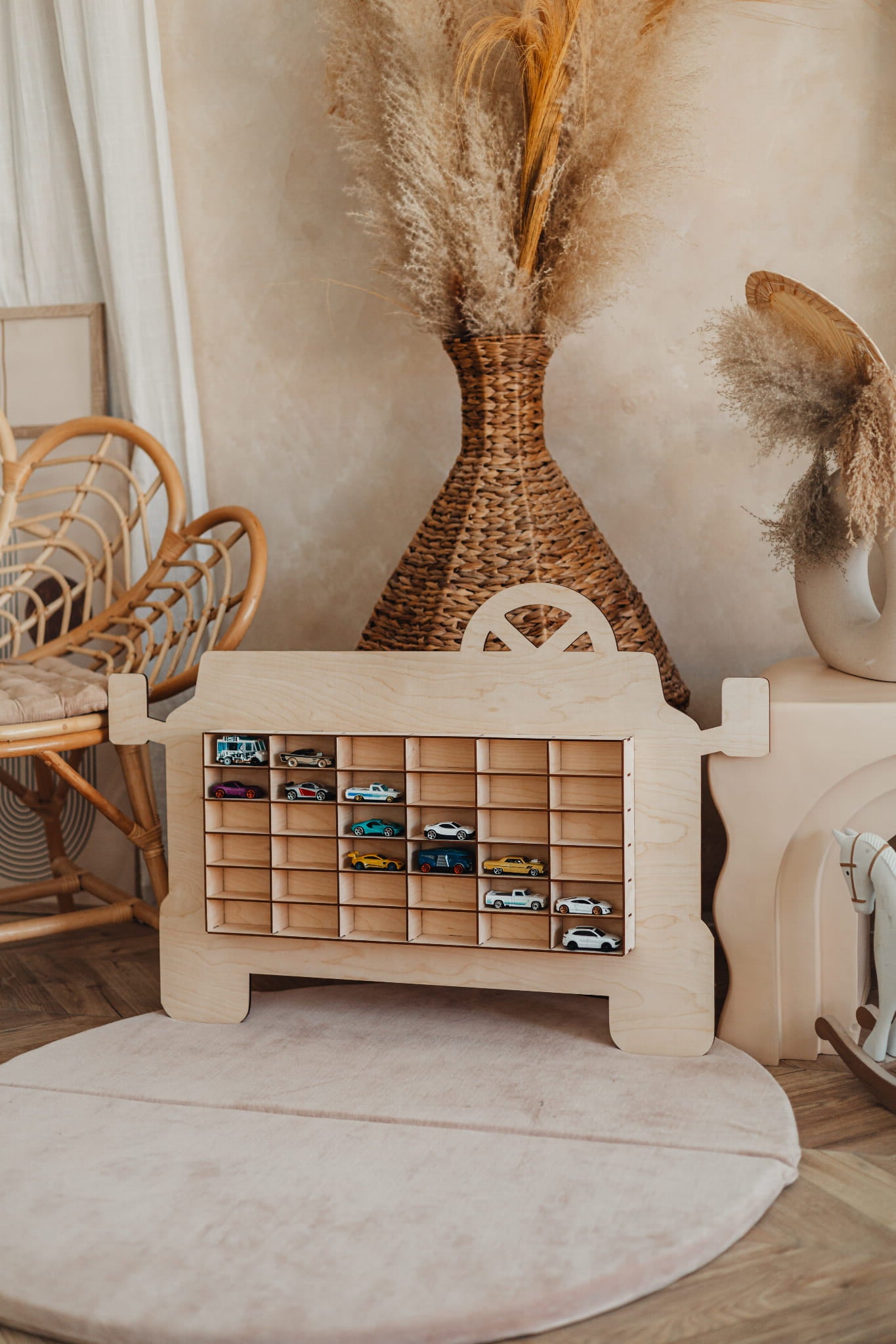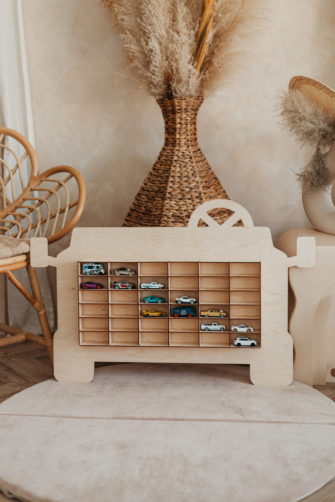 Har ditt barn en vĂ€xande samling av smĂ„ bilar som kör runt överallt? VĂ„r trĂ€-hylla formad som en bil hjĂ€lper till att parkera dem alla pĂ„ ett snyggt och roligt sĂ€tt! En charmig kombination av förvaring och dekoration â lika Ă€lskad av barn som av vuxna.