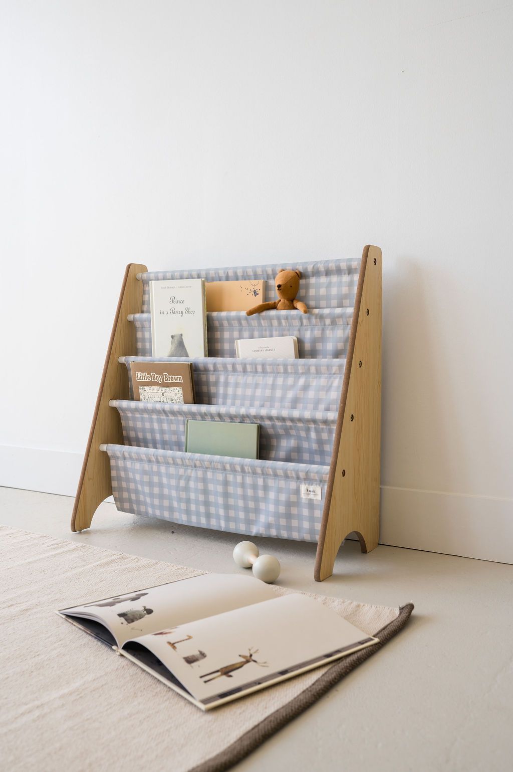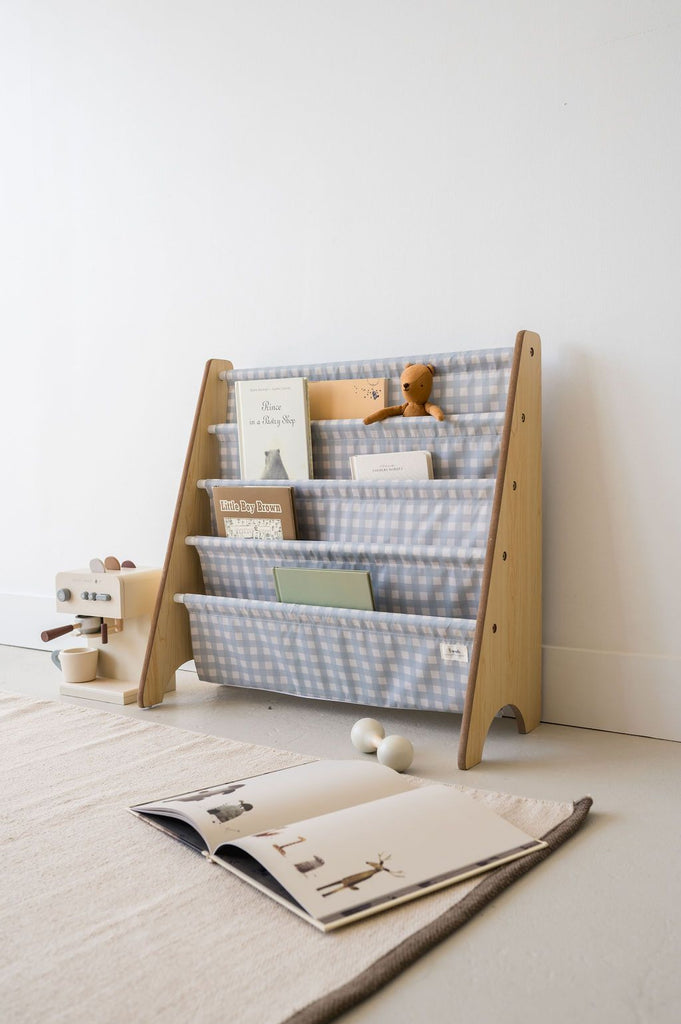 Golvbokhylla i vacker blå med rutor. I en perfekt barnhöjd så ditt barn enkelt kan nå sina favorit böcker.