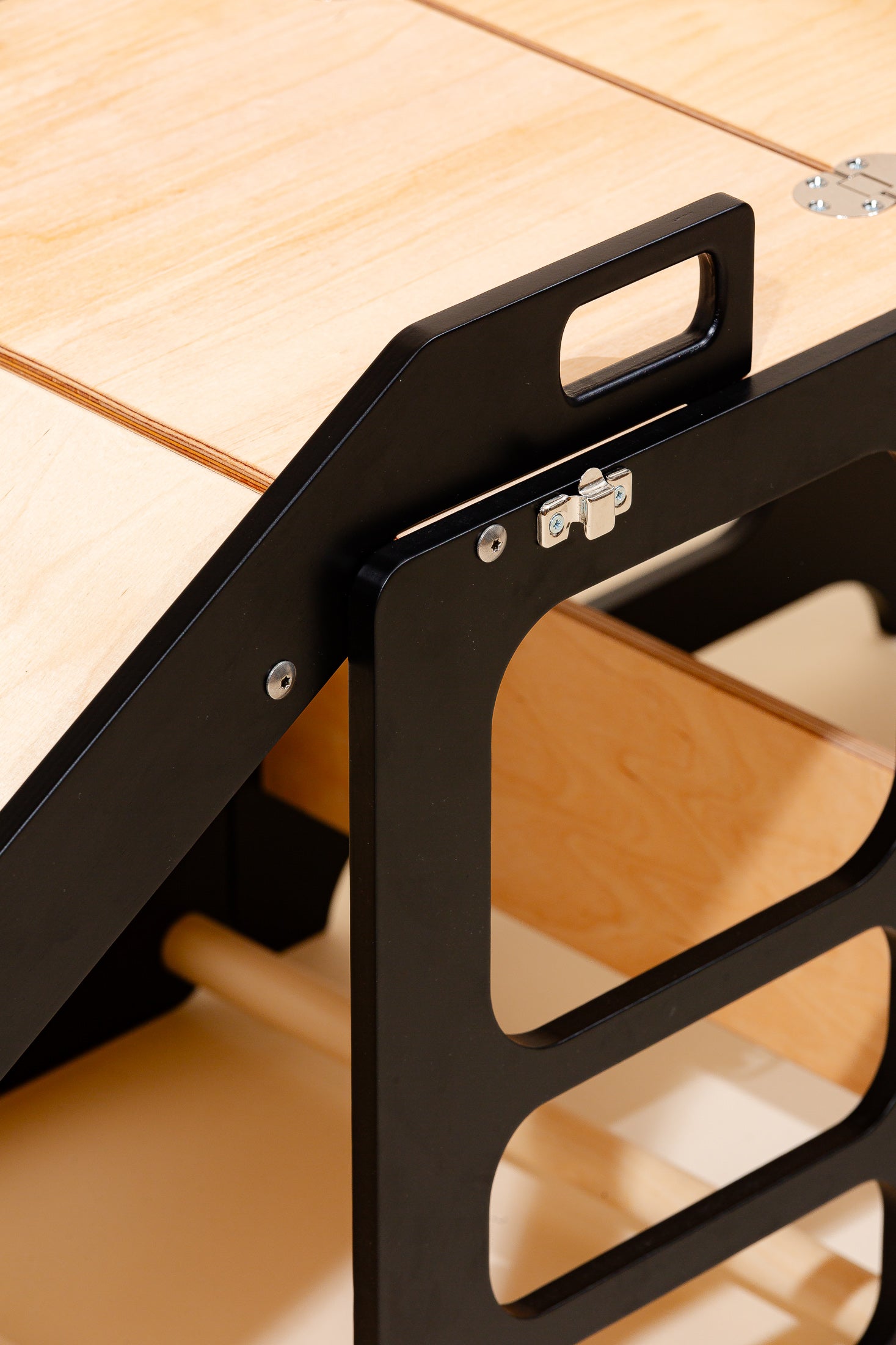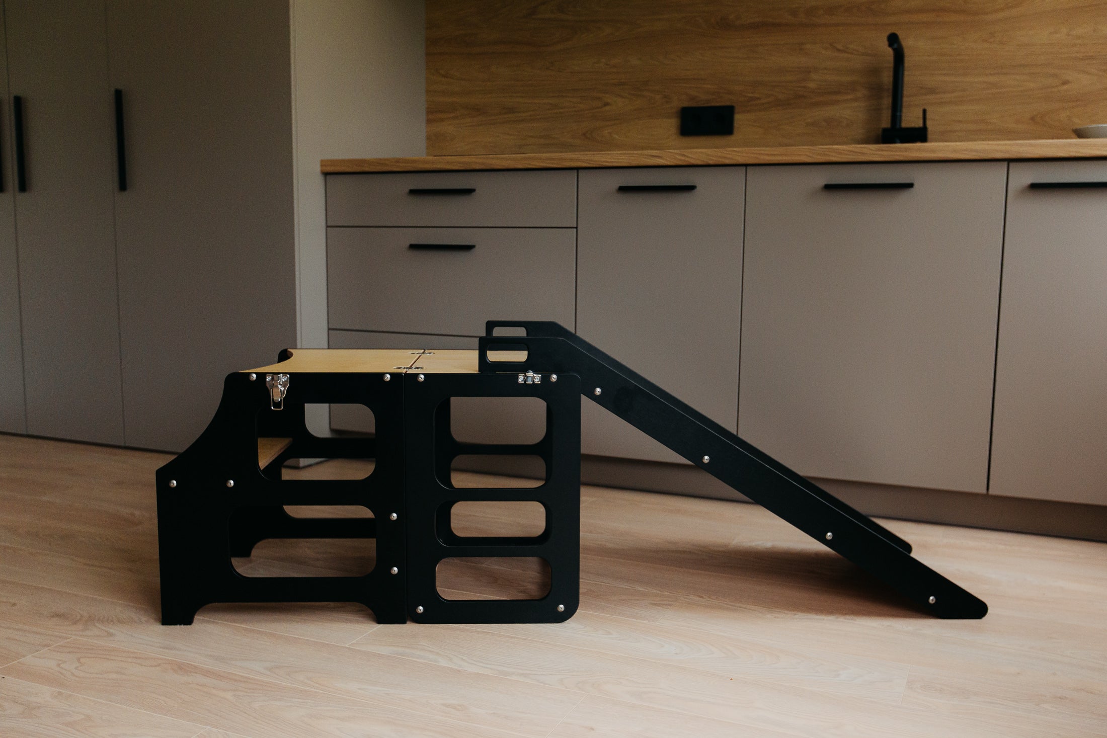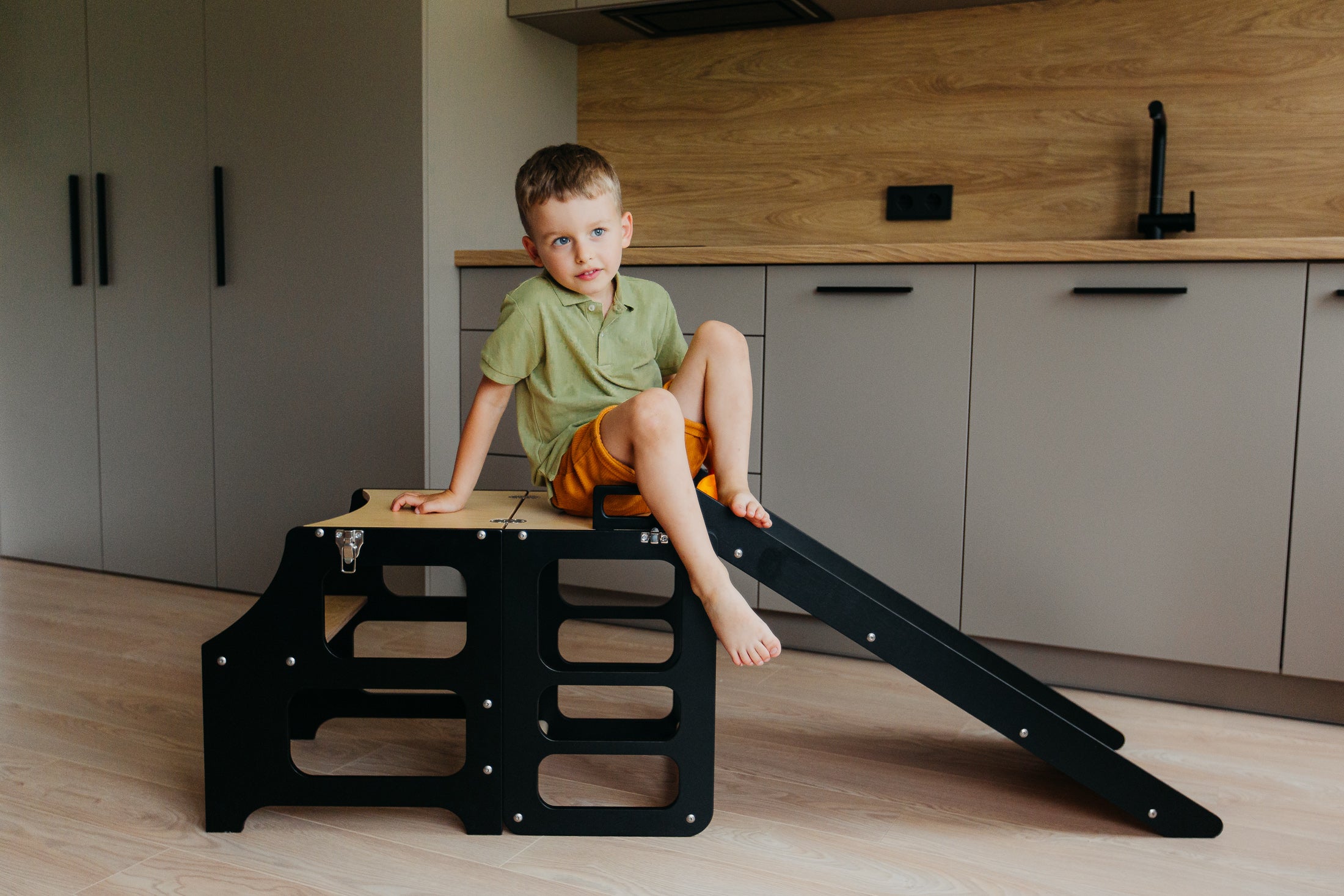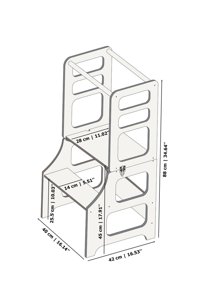 Detta kökstorn ger barnet en trygg och bekväm plats att vara nära dig i köket. Här kan små händer hjälpa till med matlagningen, njuta av en mellispaus eller låta fantasin flyga över ett ritpapper.