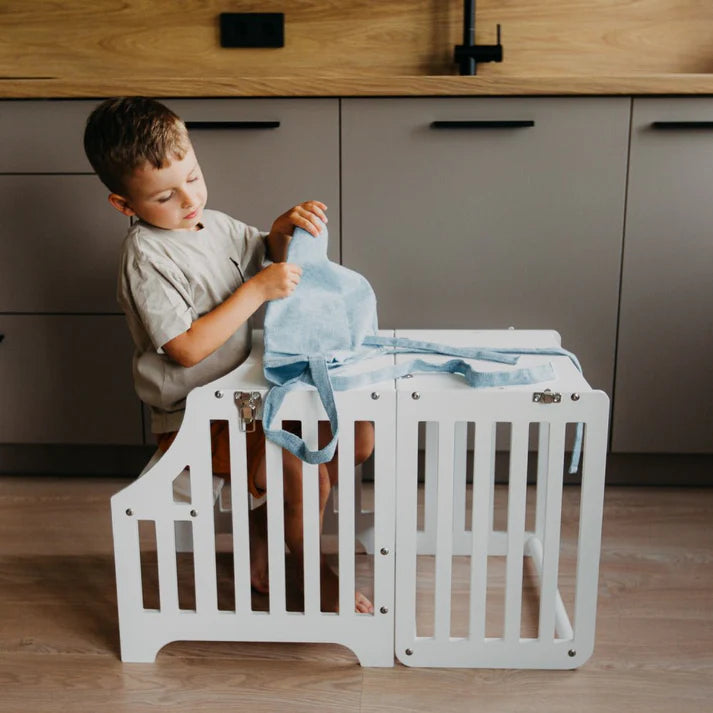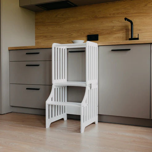Den stilrena och minimalistiska designen gör att tornet smälter in i alla typer av hem, oavsett inredningsstil. Det är en smart, stabil och säker lösning som växer med barnet – från nyfikna små hjälpredor i köket till självständiga små upptäckare.