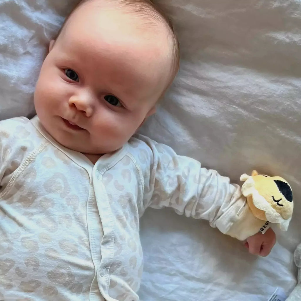 Denna handledsskallra är perfekt för små armar att skaka. Med sin inbyggda skallra och mjuka material stimulerar den både hörsel och motorik, samtidigt som den ger ditt barn en rolig och säker lekupplevelse. Storlek: 16 cm.
