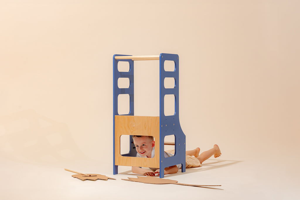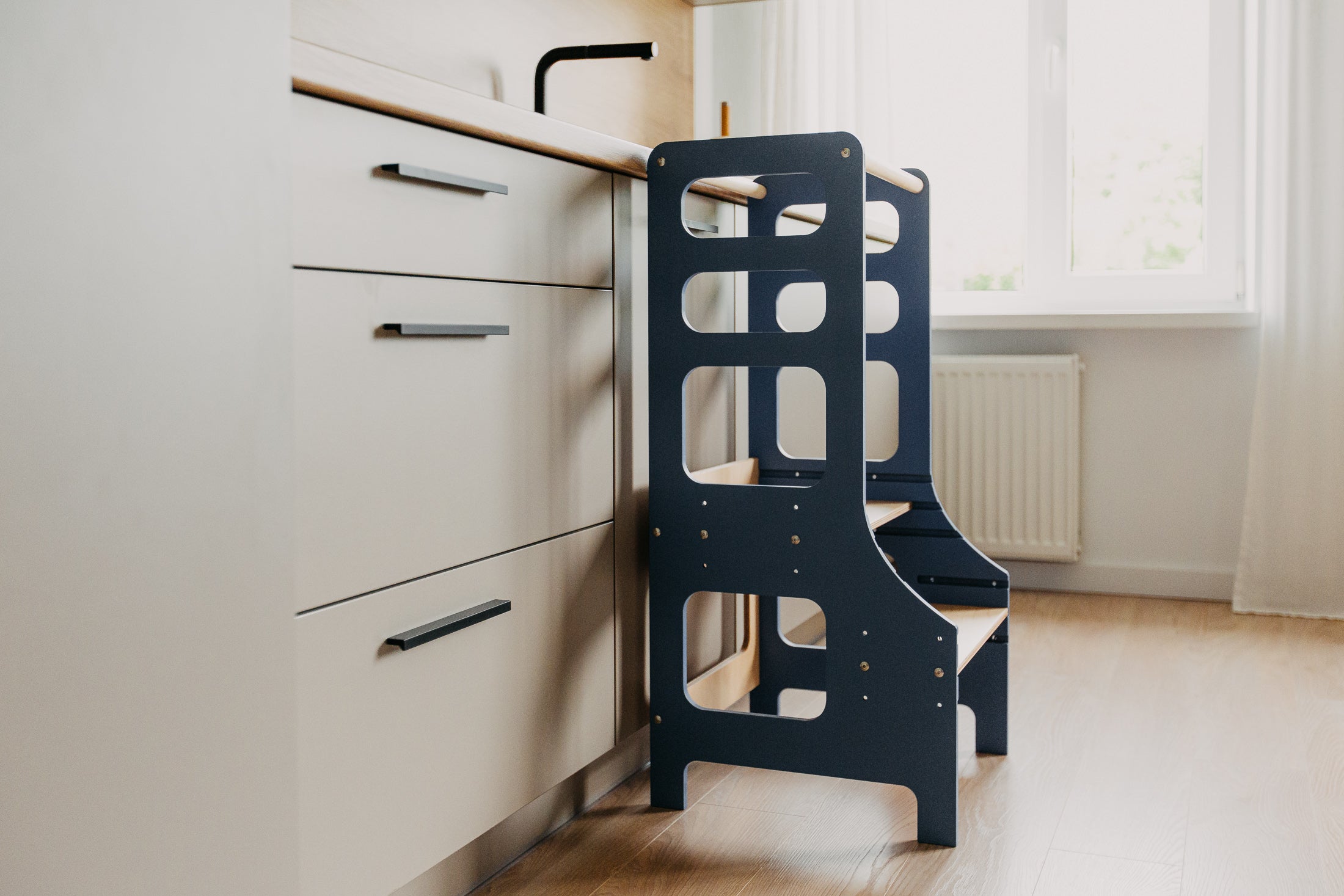 Kökstorn är en säkert sätt att låta dit barn komma upp i höjd med diskbänken. Barnet är skyddat från oavsiktligt fall när det står i det lilla tornet, omgivet av skenor. Äldre småbarn som är stabila på fötterna och redan klättrar överallt kommer att kunna klättra på och av tornet med lätthet.