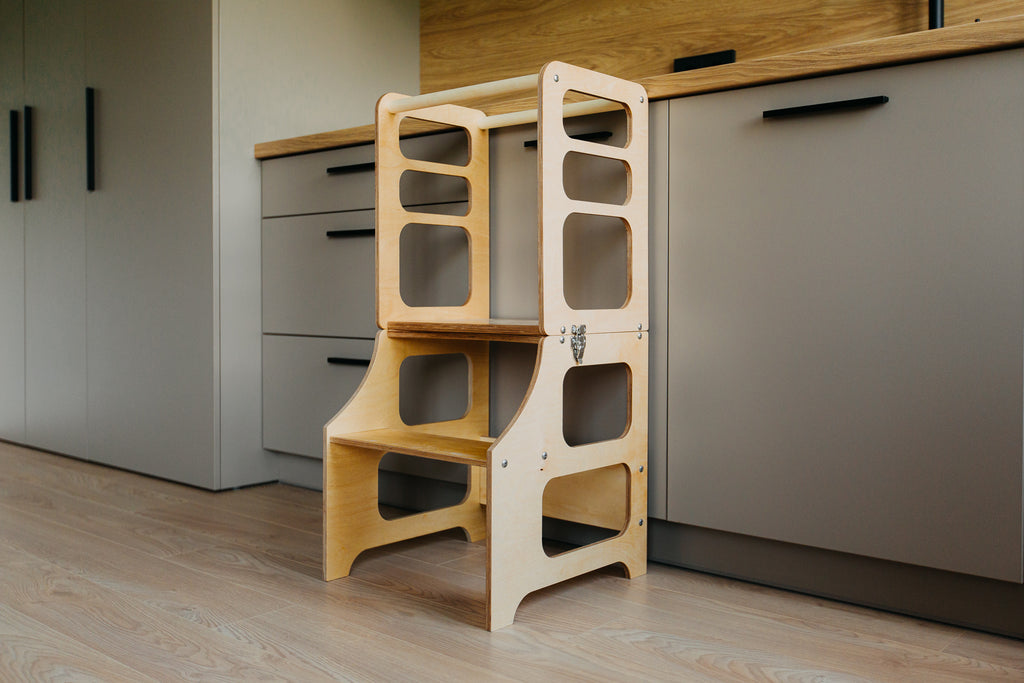 När det är dags att laga mat blir det ett tryggt och stabilt kökstorn där barnet står säkert i höjd med bänken. De skyddande sidorna ger extra säkerhet, så du kan ha ditt barn nära även när du hanterar varma kastruller eller skarpa redskap. För barn som redan klättrar själva är det enkelt att ta sig upp och ner.