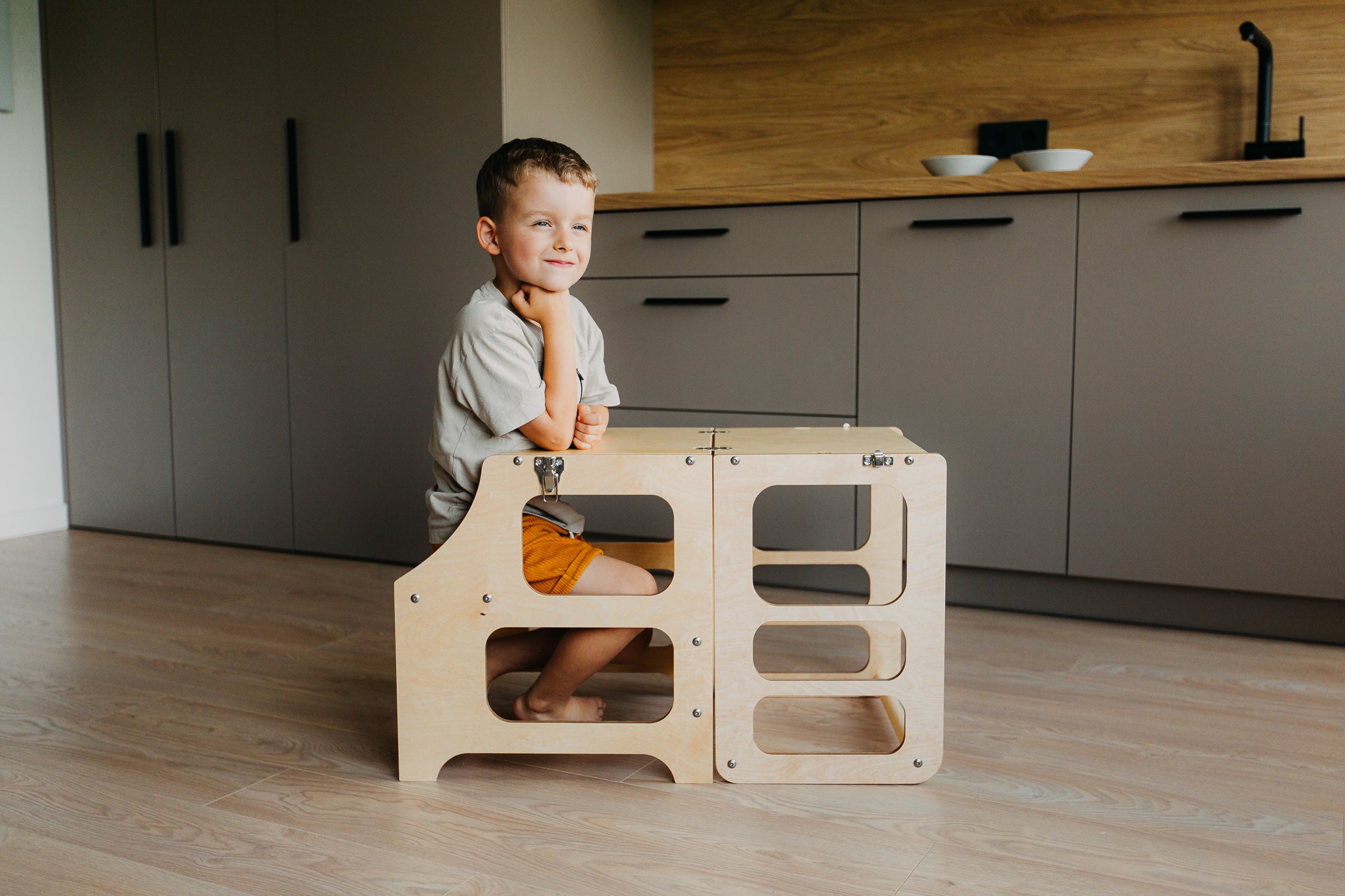 Ge ditt barn möjlighet att vara med i vardagens alla små äventyr med ett multifunktionellt kökstorn. På ett ögonblick kan tornet förvandlas till ett litet bord med stol, perfekt för att rita, bygga med klossar, leka med favoritleksaker eller njuta av ett mellanmål.