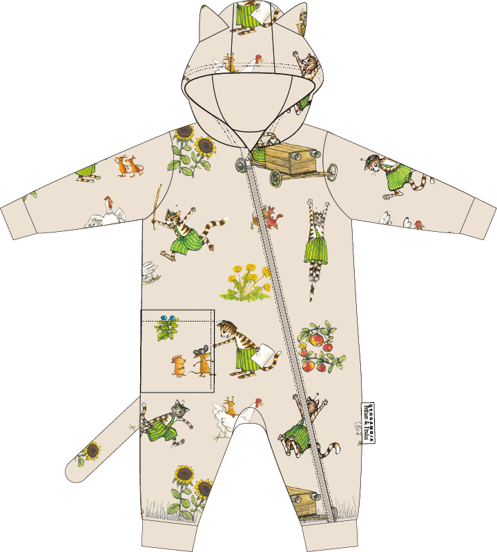 College jumpsuit med Pettson & Findus-motiv. Mjuk, borstad insida.Katt-öron- och svans som detalj. Avtagbar luva och mjuka muddar i ärm- och benlsut. I storlek 62/68 och 74/80 går blixtlås ner i benet, för enkel påklädning.