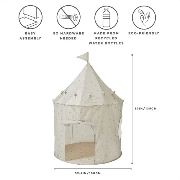 Tältet har ett fint spetsigt tak med flagga och dekorationer, 2 nätfönster och 1 dörr som kan rullas upp och fästas med band.