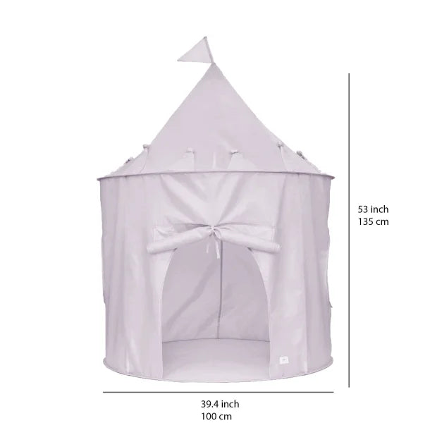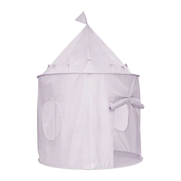 Tältet har ett fint spetsigt tak med flagga och dekorationer, 2 nätfönster och 1 dörr som kan rullas upp och fästas med band.