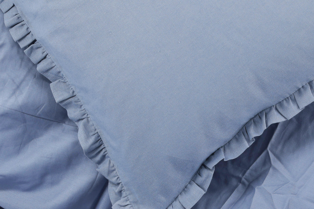 Ge barnrummet lite extra charm med påslakansetet Lias! Det mjuka bäddsetet i bomull och linne kommer i en härlig blå nyans och stängs smidigt med knappar längst ner. De fina volangerna runt kanterna ger sängen ett mysigt blickfång som barnen älskar. Perfekt för små som vill krypa ner i gosiga lakan efter en lång dag.