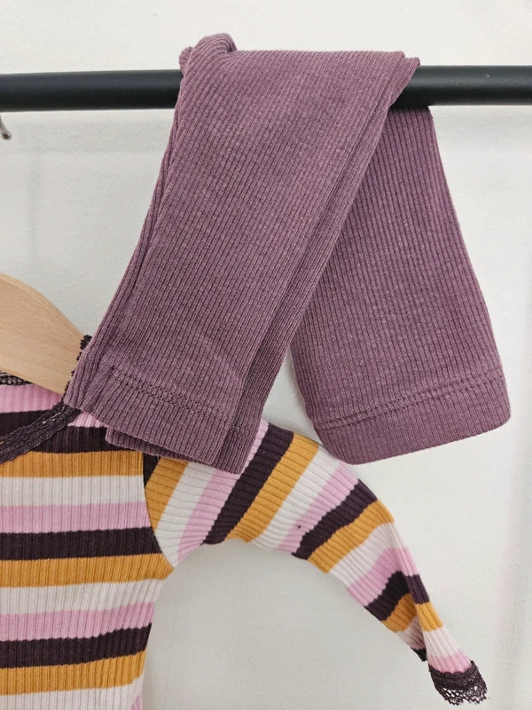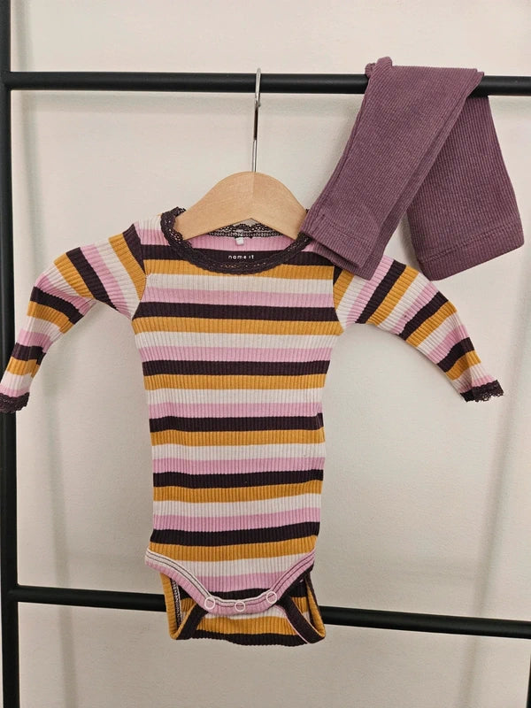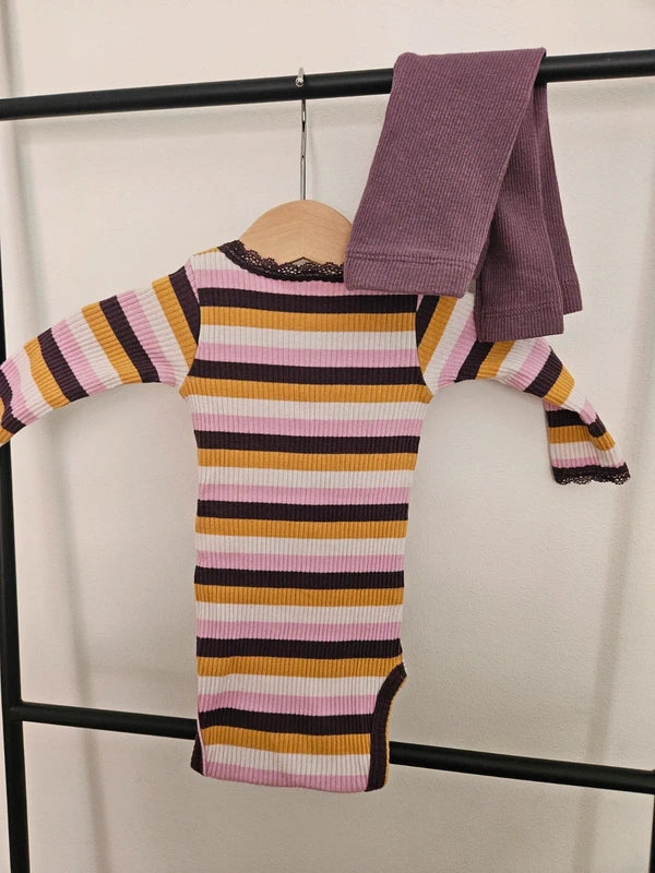 Fint set med lilarandig body och lila tights.