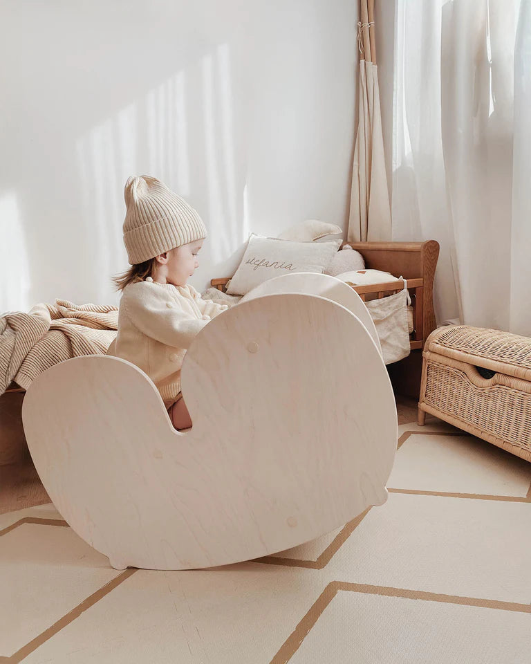 NUPPU är ingen vanlig gunghäst – den är en fantasifull lekkamrat med superkrafter! Den mjukt formade, abstrakta designen gör att den kan användas åt två håll, och vips får den helt nya funktioner. När du vänder den upp och ner förvandlas NUPPU från en gunghäst till ett litet skrivbord med bänk – eller till ett charmigt nattduksbord i barnrummet. Samma möbel, tre olika äventyr!