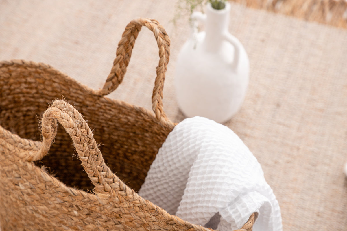 Ge barnrummet en praktisk och modern touch med Pune-korgen! Den här snygga korgen i flätad jute har en hög, stilren form och två praktiska handtag. Perfekt för att förvara filtar, gosedjur eller andra småsaker.