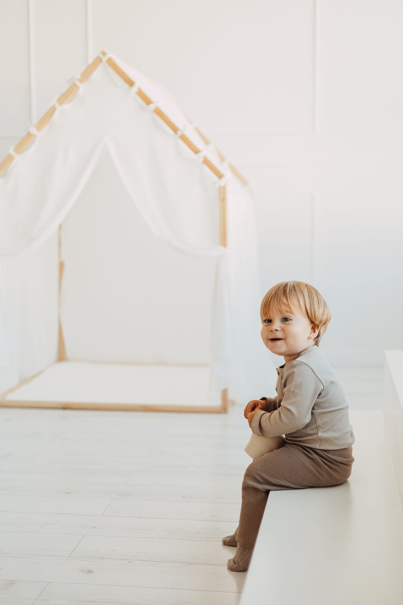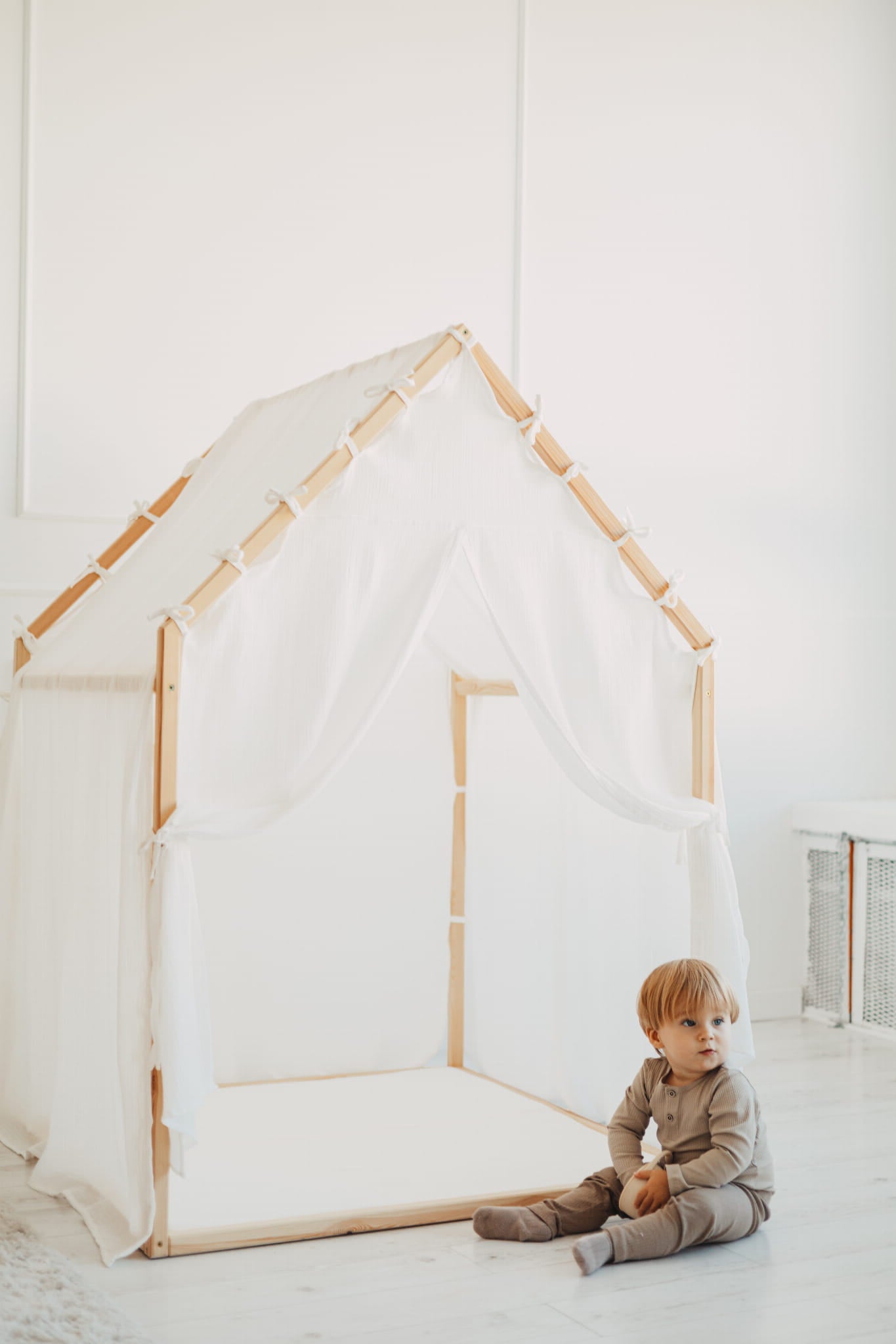Huset har stilren skandinavisk design byggt av naturligt furuträ och svept i en fluffig muslingardin av 100 % bomull, vilket gör att huset smälter in i alla typer av barnrum och ger en trygg, ombonad känsla som bjuder in till både bus och vila. Den mjuka, skumfyllda mattan gör golvet perfekt för allt från sagostunder till hoppande små fötter.