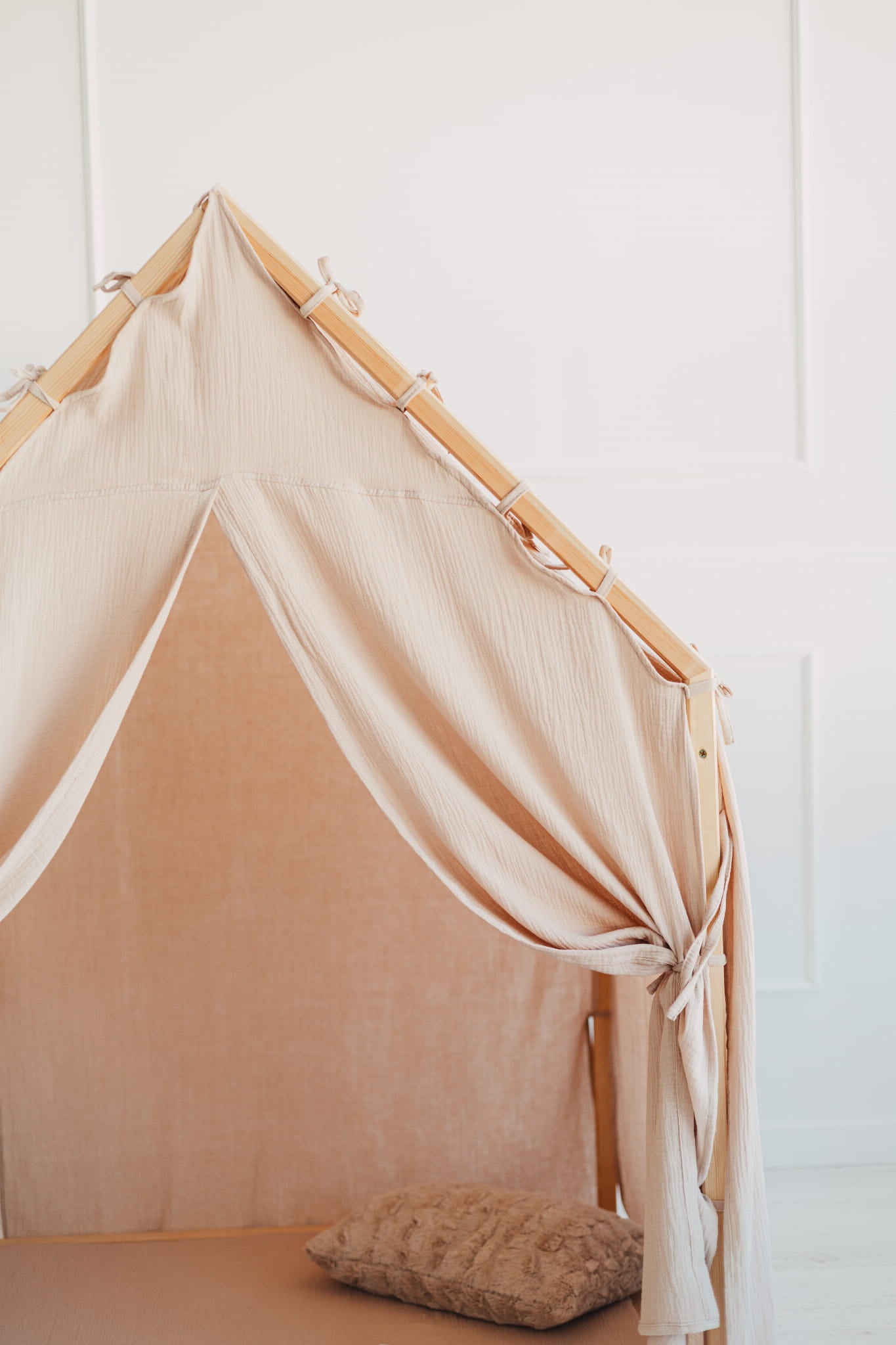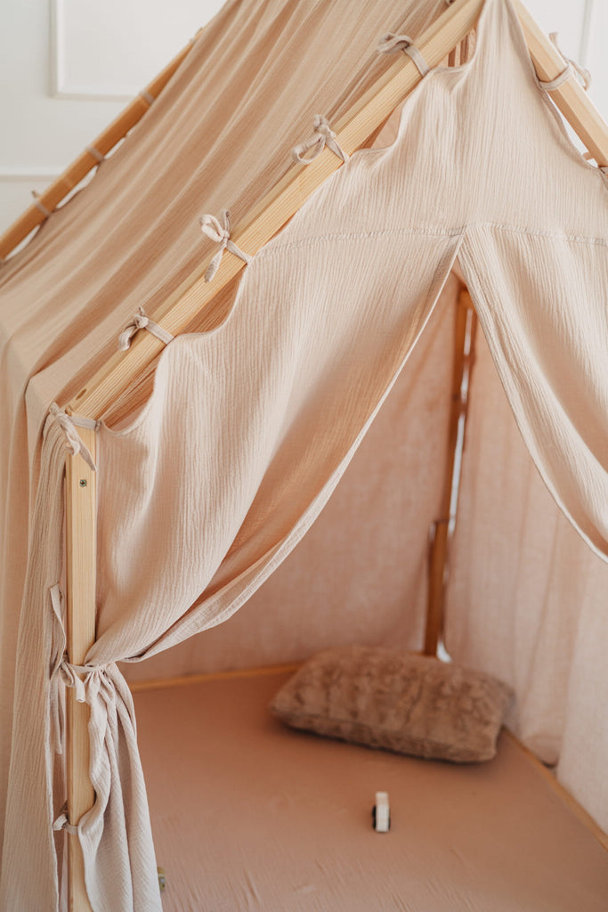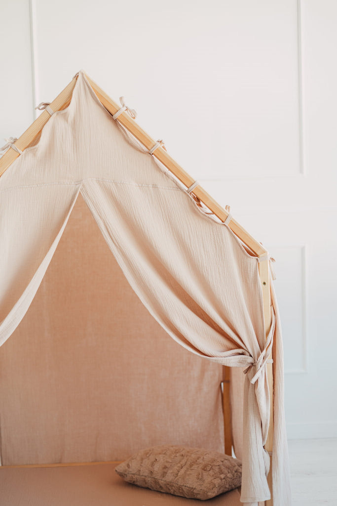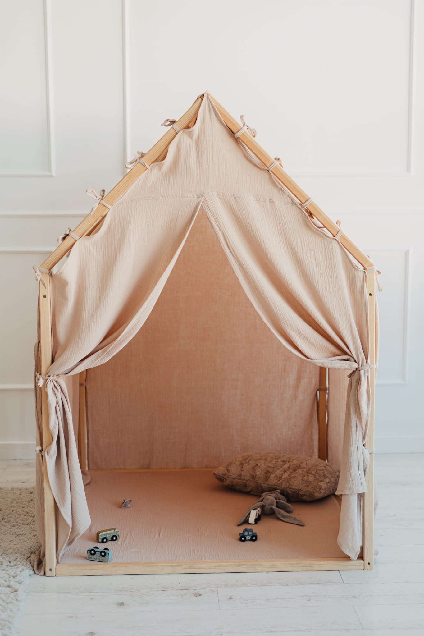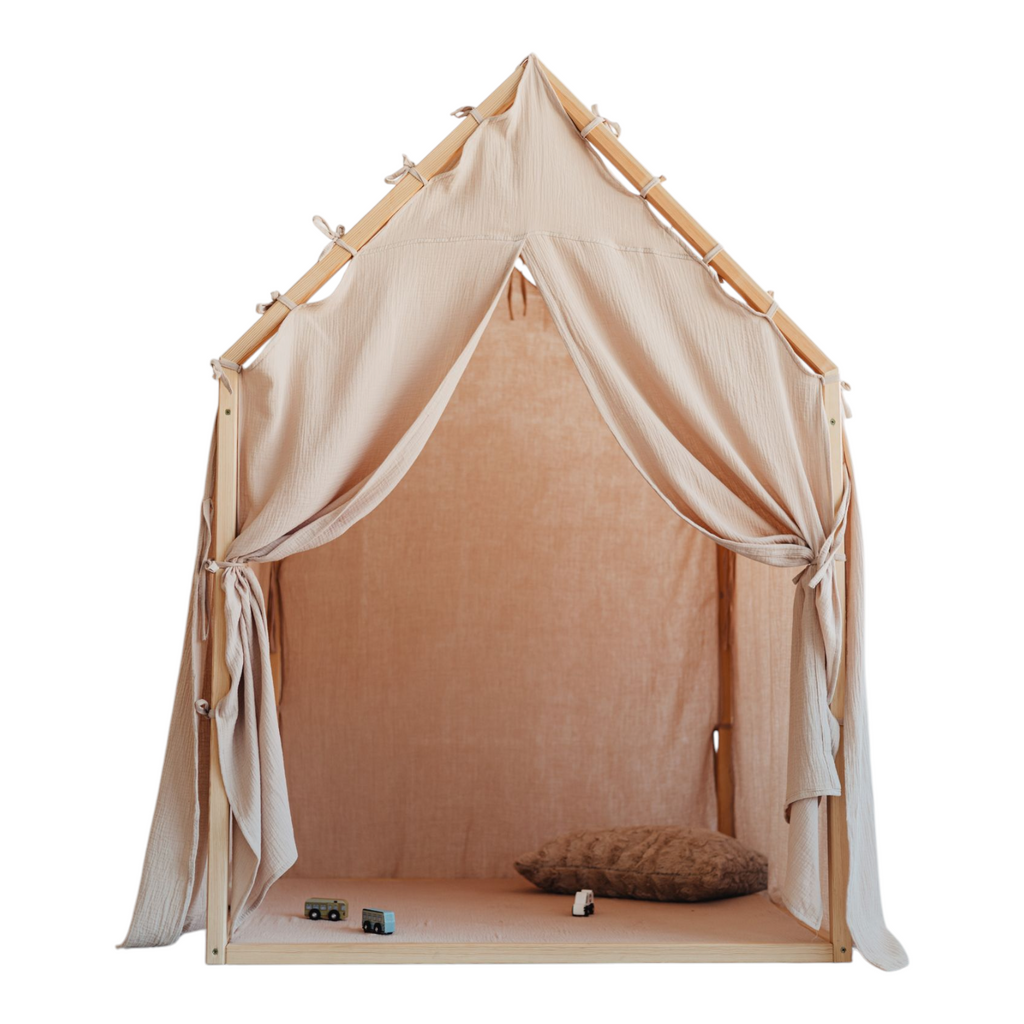 Huset är tillverkat av naturligt furuträ och har en stilren skandinavisk design. Den fluffiga muslingardinen i 100 % bomull omsluter huset och skapar en lugn, trygg atmosfär som passar lika bra för lekfulla stunder som för avkopplande pauser. Den inkluderade skumgummimattan gör golvet bekvämt och inbjudande för både sagostunder och små lekar.