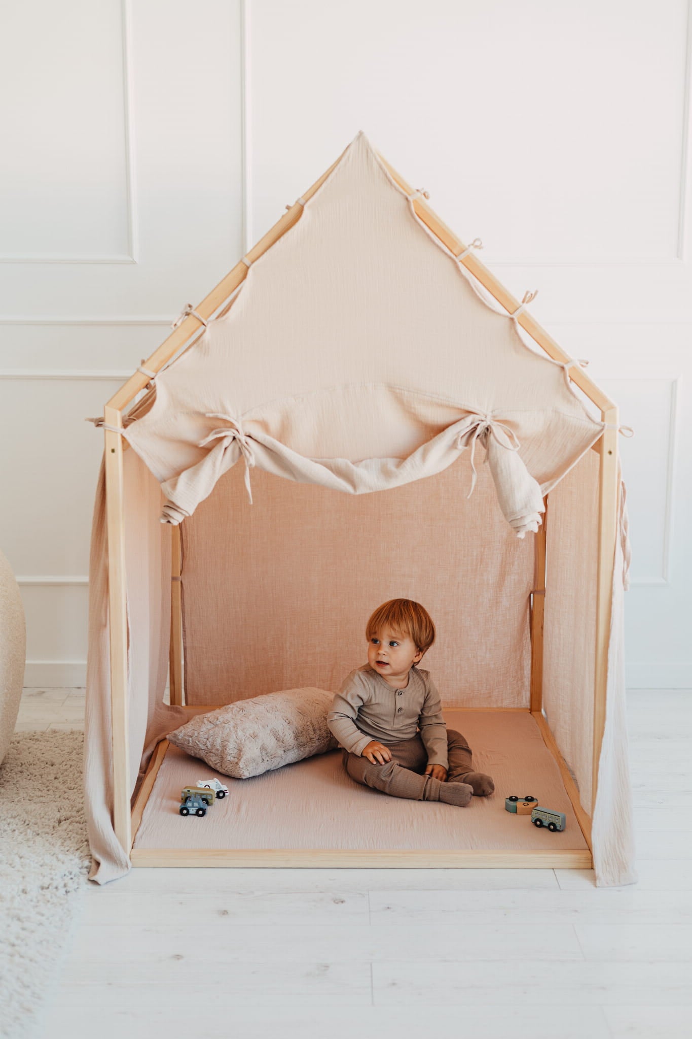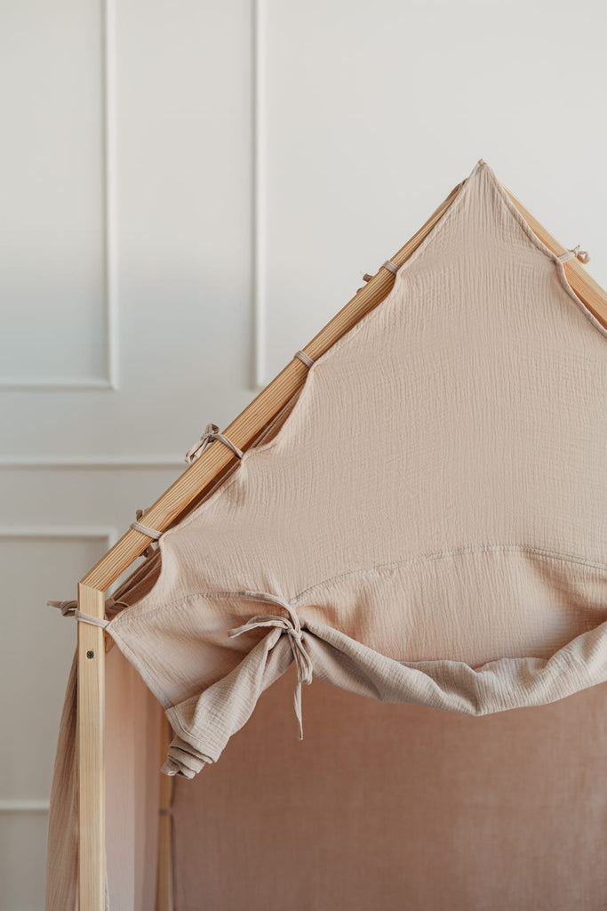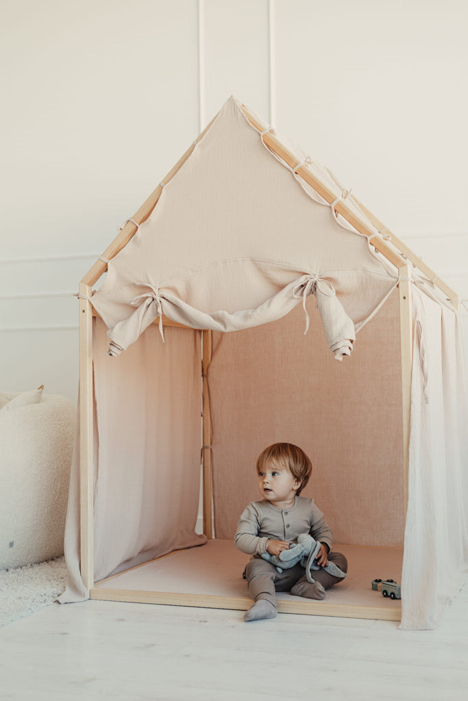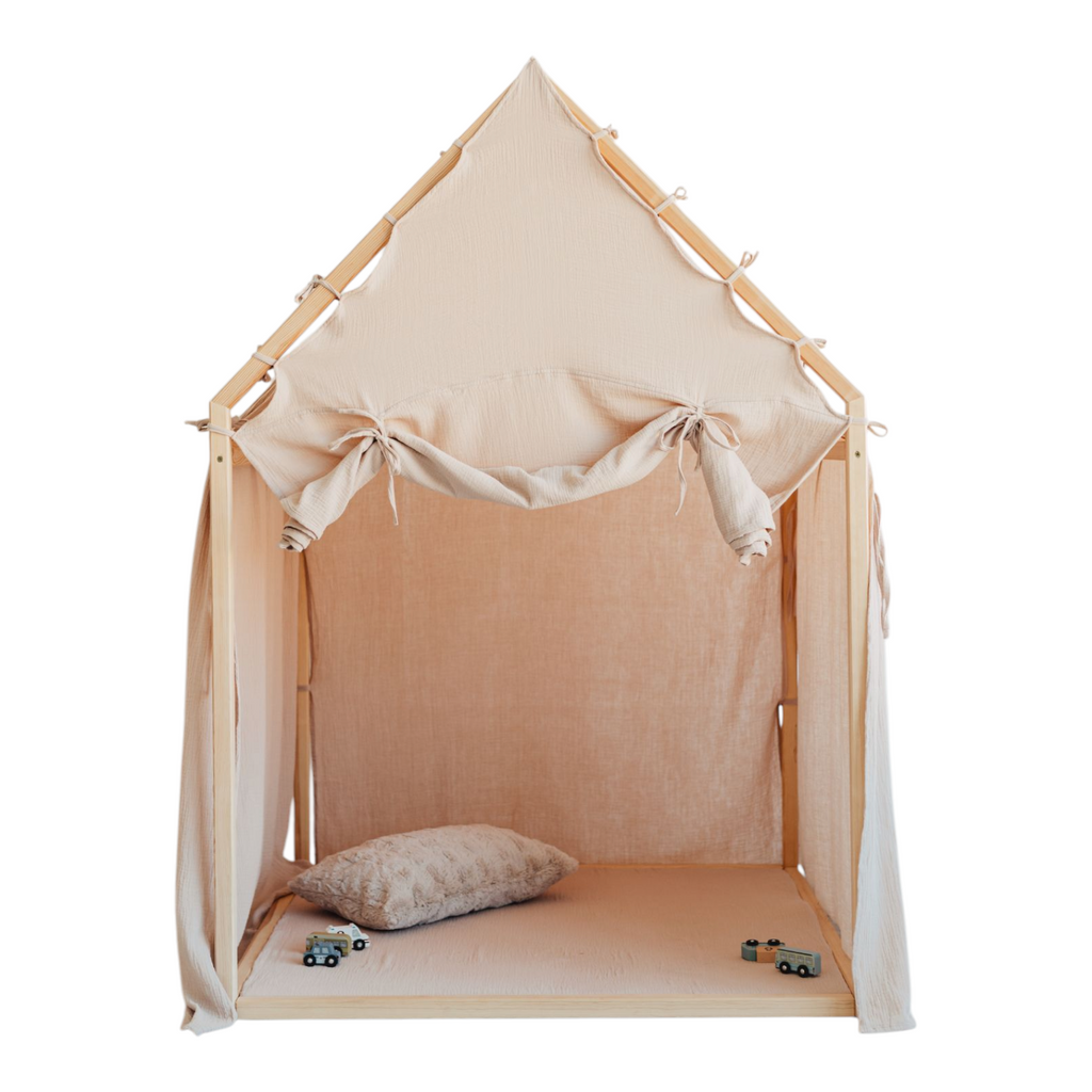 Huset är tillverkat i naturligt furuträ och har en enkel, skandinavisk design som smälter in i alla typer av barnrum. Den mjuka muslingardinen i 100 % bomull omsluter huset och skapar en trygg och ombonad känsla som både inspirerar till lek och bjuder in till lugna stunder. Den medföljande skumgummimattan gör golvet extra bekvämt – perfekt för sagostunder, pyssel eller små upptäcktsfärder.