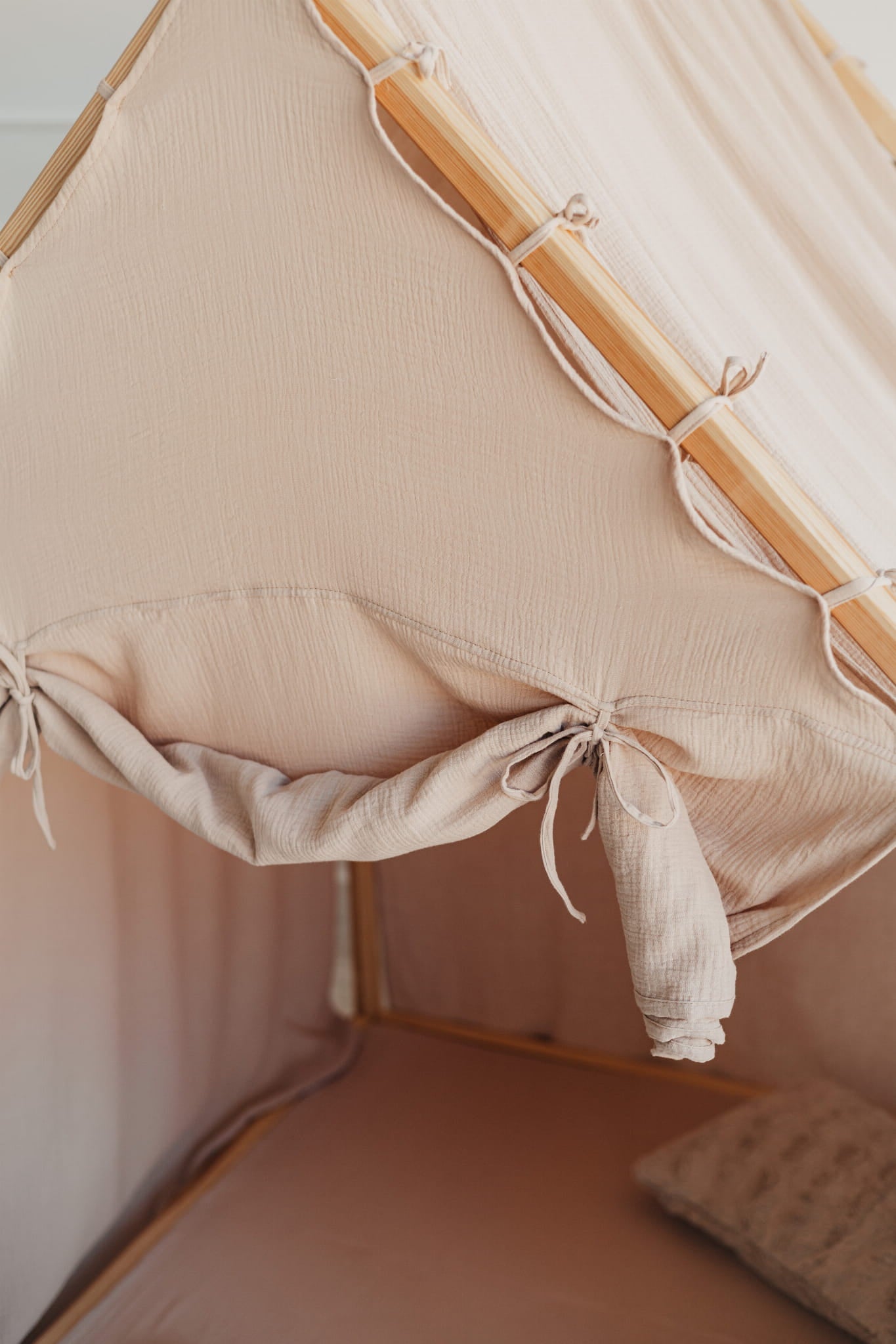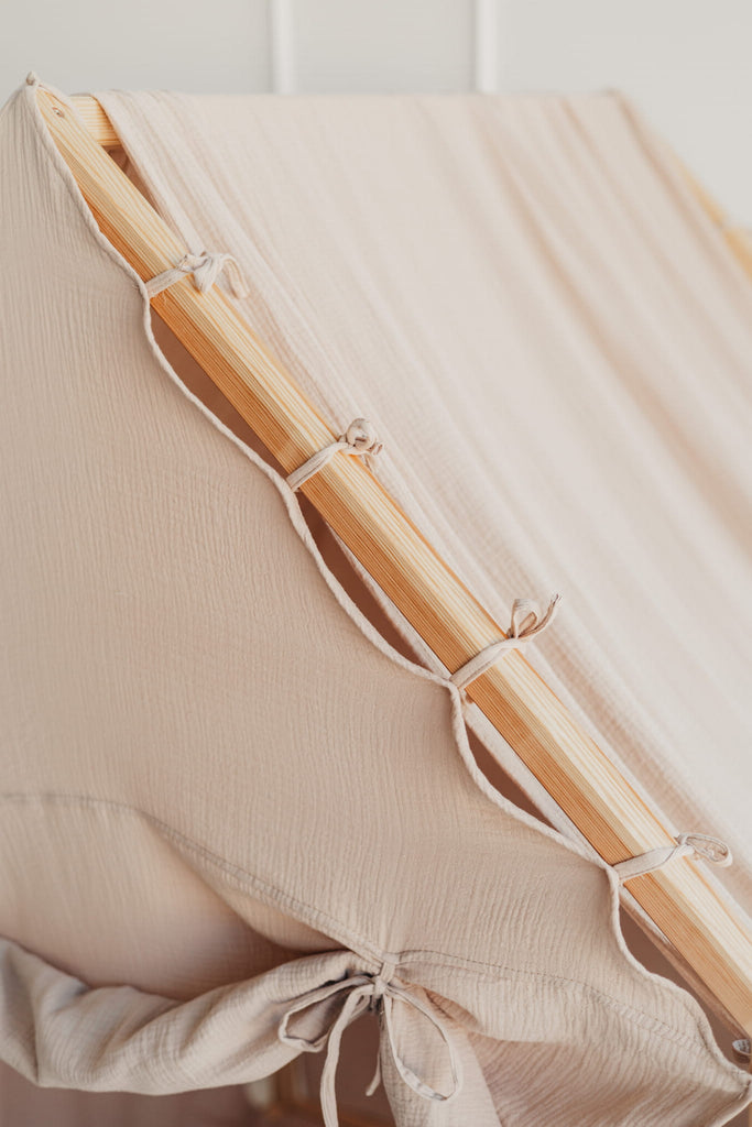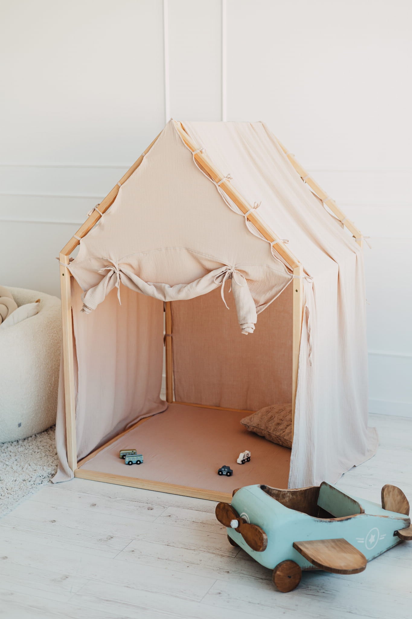 Huset är tillverkat i naturligt furuträ och har en enkel, skandinavisk design som smälter in i alla typer av barnrum. Den mjuka muslingardinen i 100 % bomull omsluter huset och skapar en trygg och ombonad känsla som både inspirerar till lek och bjuder in till lugna stunder. Den medföljande skumgummimattan gör golvet extra bekvämt – perfekt för sagostunder, pyssel eller små upptäcktsfärder.
