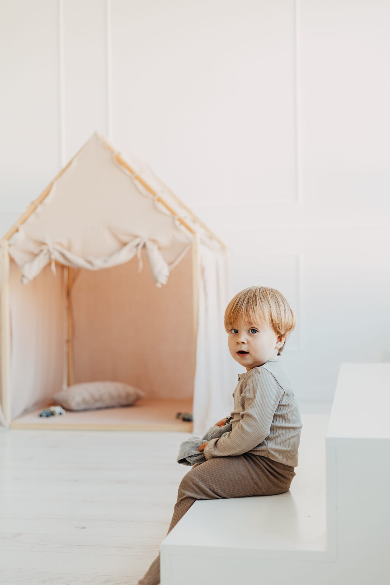 Barnhus med muslingardin & skumgummimatta – ett litet krypin för stora äventyr