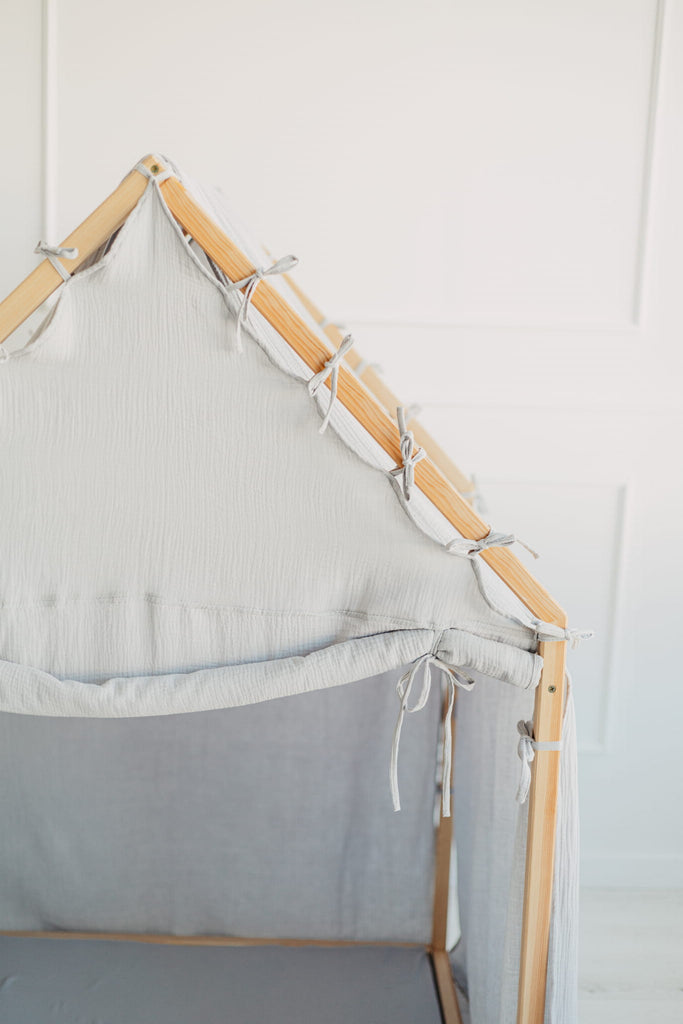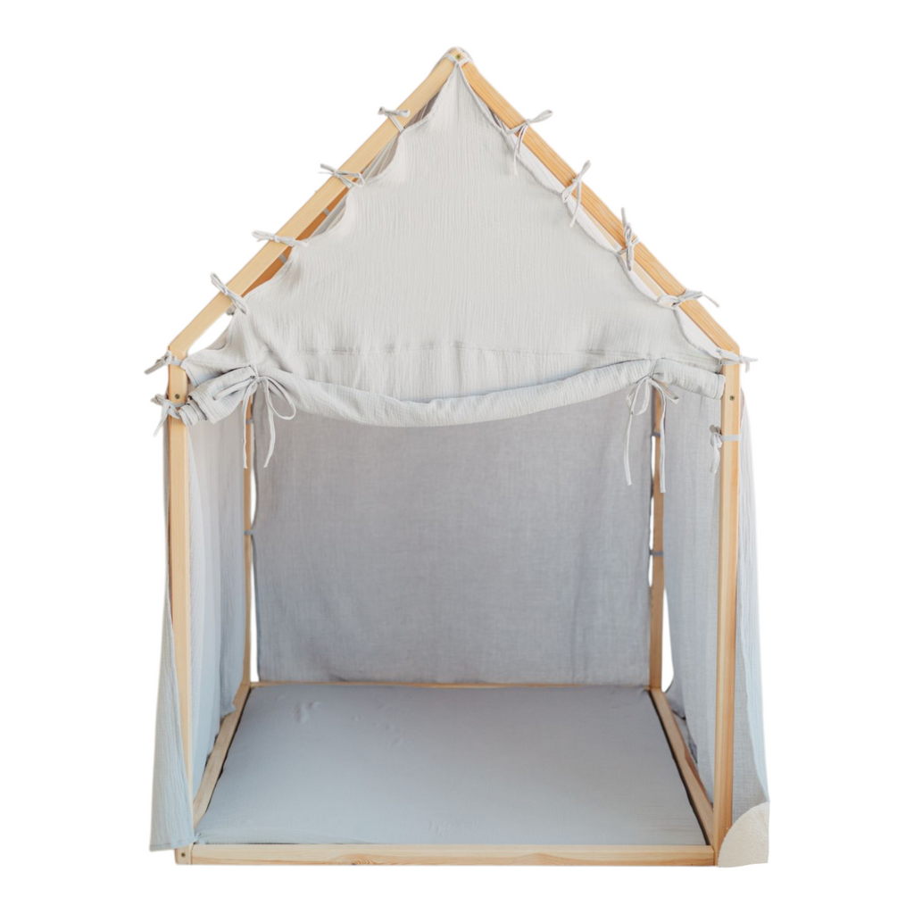 Huset är byggt i naturligt furuträ och präglas av en enkel, skandinavisk design som passar in i alla typer av barnrum. Den mjuka muslingardinen i 100 % bomull omsluter huset och ger en ombonad känsla som både inspirerar till lek och bjuder in till lugna stunder. Med den medföljande skumgummimattan blir golvet extra bekvämt – perfekt för sagoläsning, pyssel eller små äventyr.