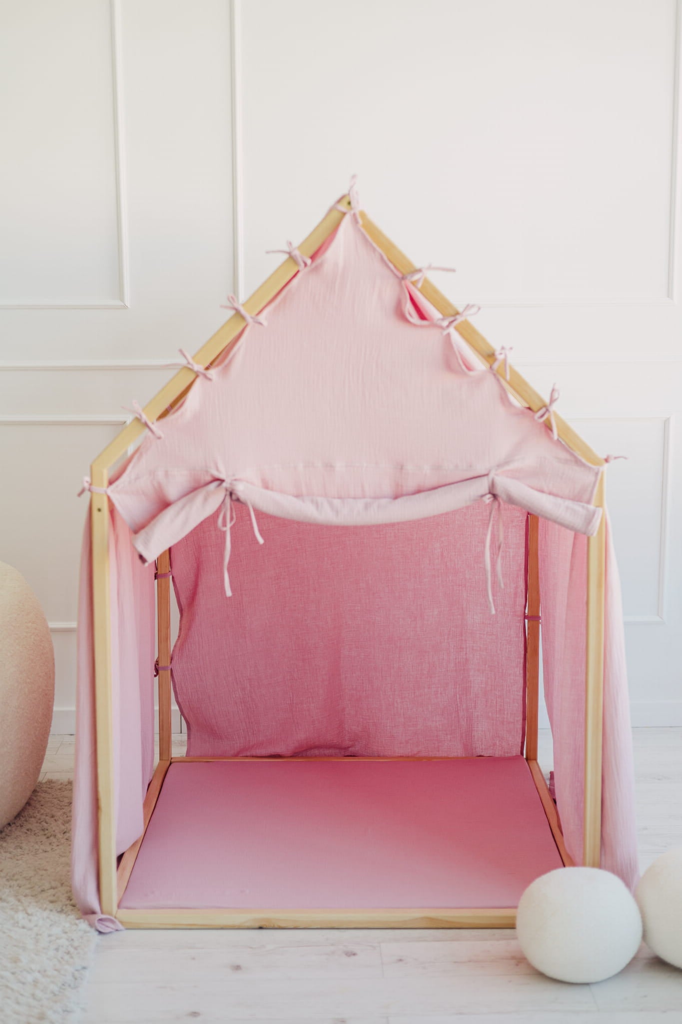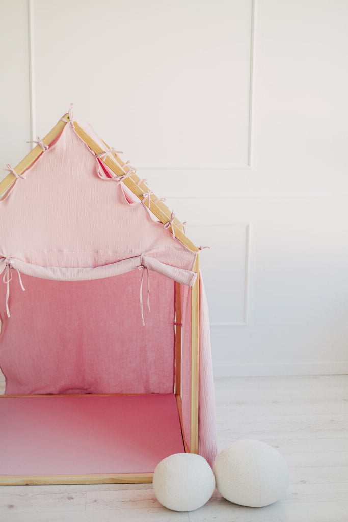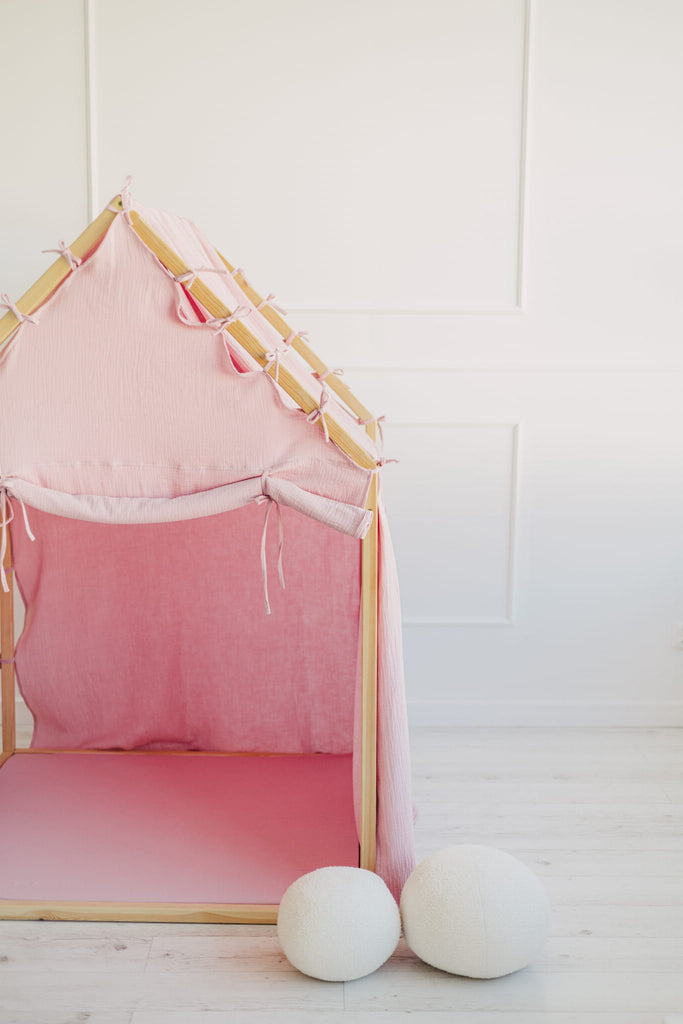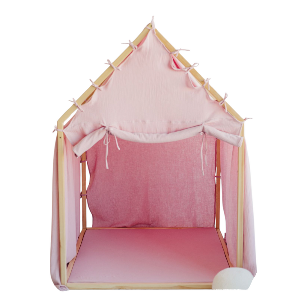 Huset är byggt i naturligt furuträ och präglas av en enkel, skandinavisk design som passar in i alla typer av barnrum. Den mjuka muslingardinen i 100 % bomull omsluter huset och ger en ombonad känsla som både inspirerar till lek och bjuder in till lugna stunder. Med den medföljande skumgummimattan blir golvet extra bekvämt – perfekt för sagoläsning, pyssel eller små äventyr.