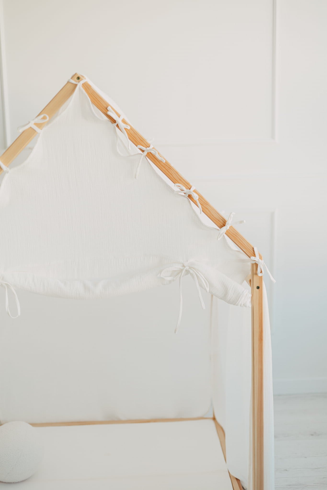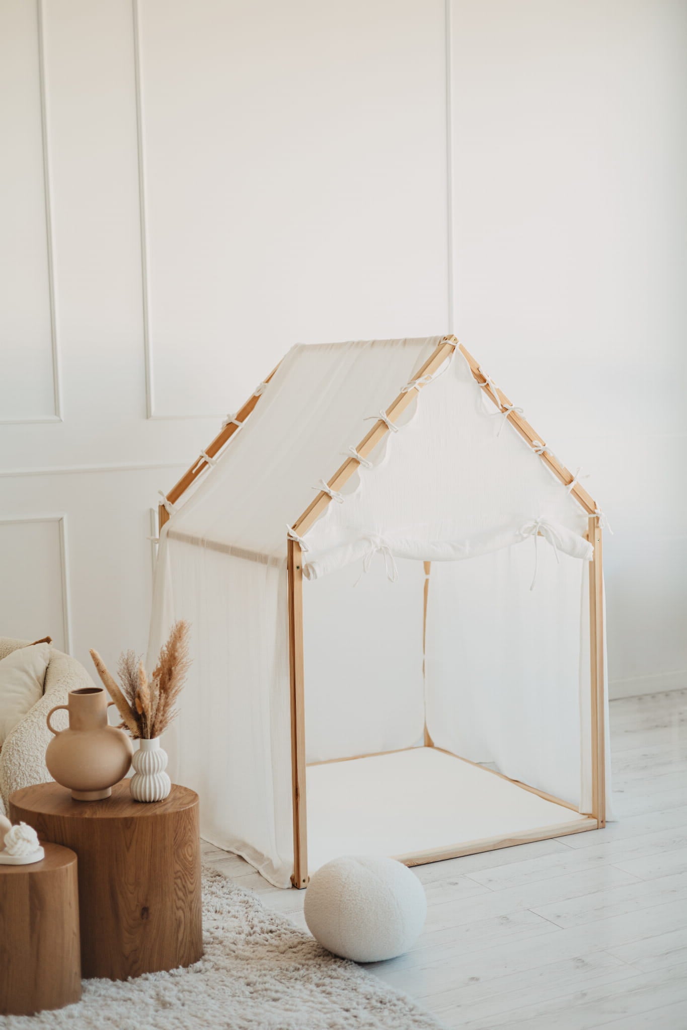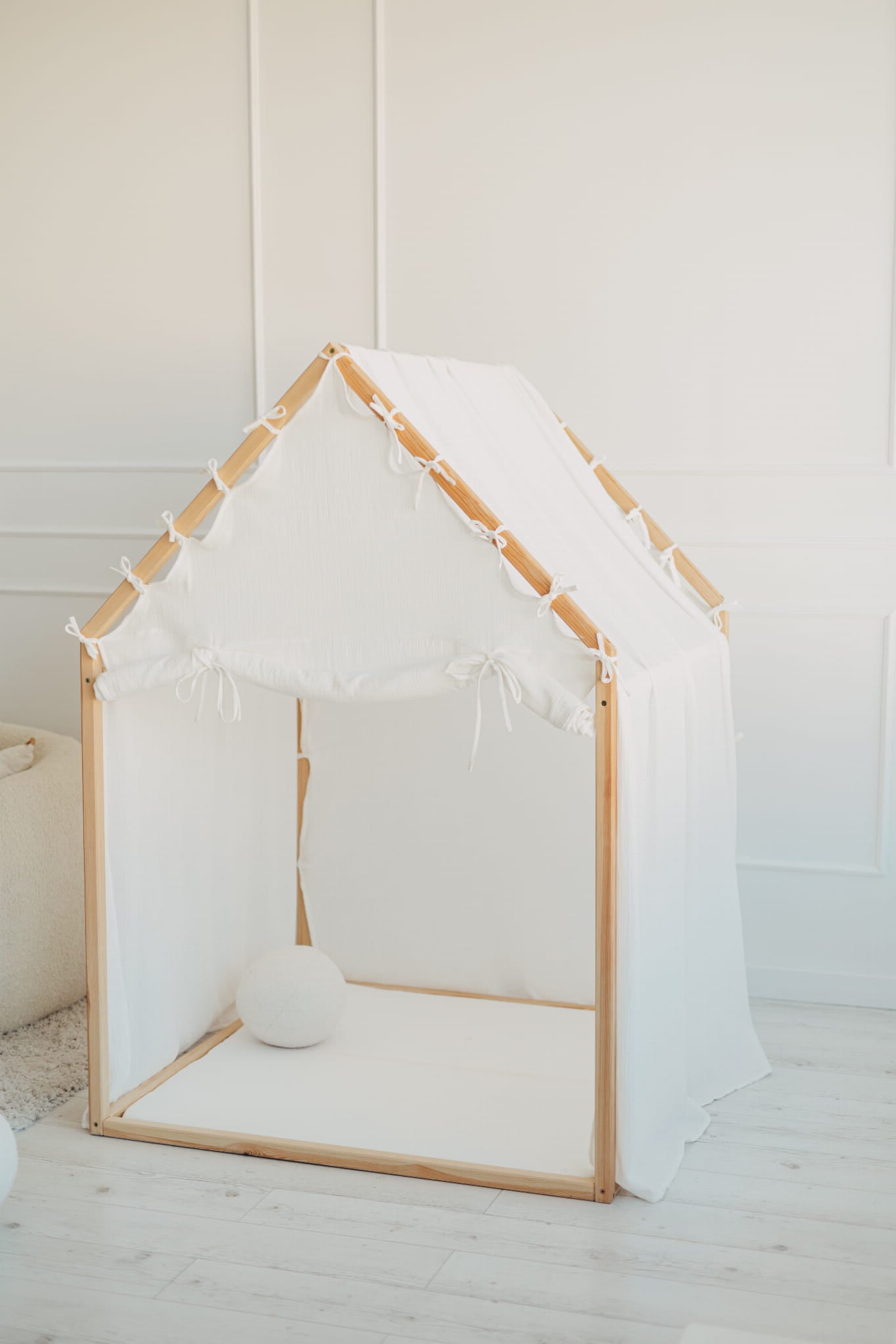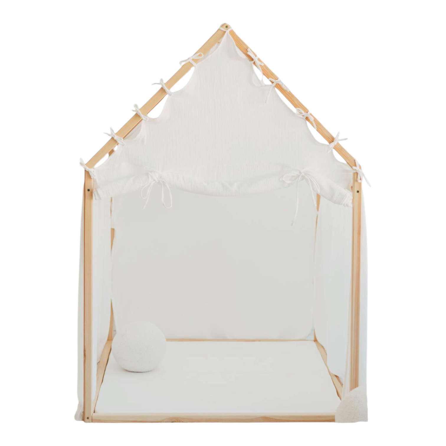 Huset är tillverkat av naturligt furuträ och har en stilren skandinavisk design. Den fluffiga muslingardinen i 100 % bomull omsluter huset och skapar en lugn, trygg atmosfär som passar lika bra för lekfulla stunder som för avkopplande pauser. Den inkluderade skumgummimattan gör golvet bekvämt och inbjudande för både sagostunder och små lekar.
