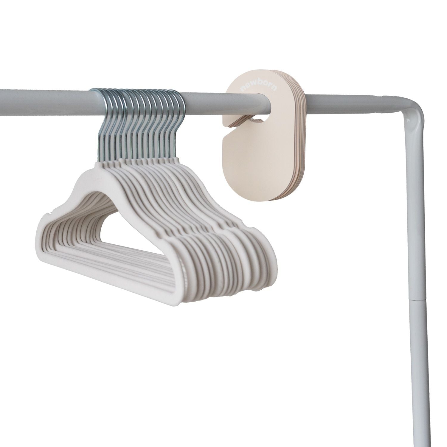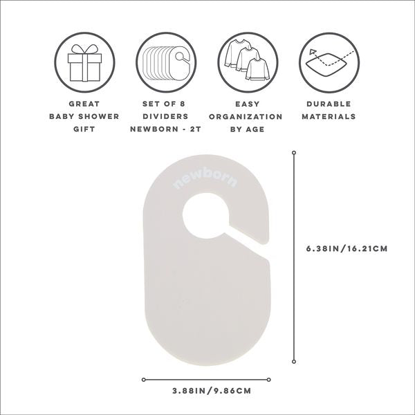 De medföljande 8 garderobsavdelarna gör det enkelt att sortera kläder efter ålder och storlek – perfekt för både nya och ärvda plagg. Avdelarna har tydlig engelsk text på båda sidor: Newborn, 0–3 months, 3–6 months, 6–9 months, 9–12 months, 12–18 months, 18–24 months och 2 years.